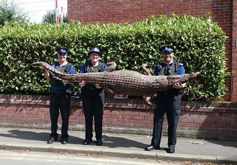 Three Trafford PCSO’sstumbled upon a gigantic stuffed crocodile on Navigation Road Altrincham yesterday Aug 5