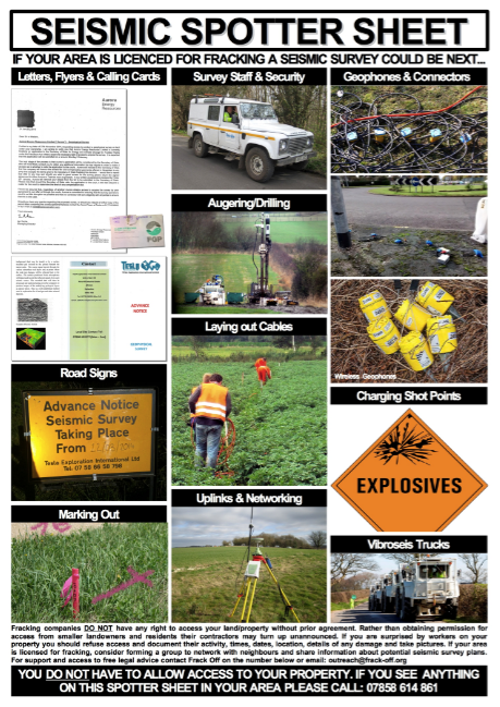 Frack Off has given out posters of what to look out for in your area, when they are doing seismic testing, this is a great guide and everyone can use it so they are aware, and can raise the alarm as soon as they can, any one seeing anything going on or has information please contact us, or at your own risk ring the number on the image.