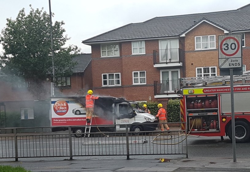 Fire fighters was dealing with a Tesco van fire this evening which started at around 8.30pm on the A56 in Stretford, Police have blocked the road both ways.