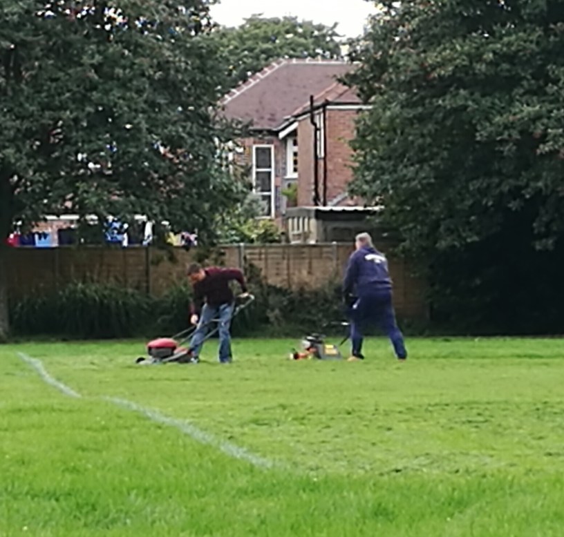 The One Trafford Partnership must be hanging there heads in shame tonight, after we witnessed a couple of people from the football club cutting the grass on the football pitch in Walton Park in Sale, with their own lawn mowers!