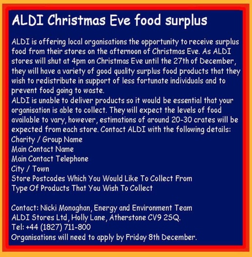 In the statement they said that Aldi will be offering local organisations the opportunity to receive surplus food from their stores on the afternoon of Christmas Eve.