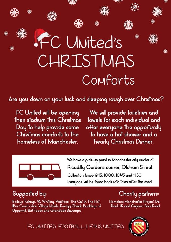 FC United are to open its doors on Christmas day to all the homeless people in Manchester, they will provide toiletries and a towel for everyone, the club will also allow every individual to have a shower and a big hearty Christmas Dinner.