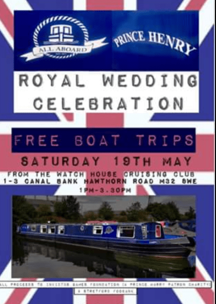 Free trips on a very special narrowboat on offer from the Watch House Cruising Club on the Bridgewater Canal in Stretford on May 19th in celebration of the big royal wedding day and in connection with the boat being commissioned by Princess Diana in 1982.