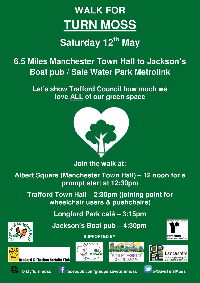 The walk will end at Jackson’s Boat at 4.30pm, and is supported by the Friends of Longford Park, Stretford In Bloom, the Ramblers, Chorlton Wombles, The Stretford & Chorlton Socialist Club, and the Lancashire Campaign for the Protection of Rural England, among others.