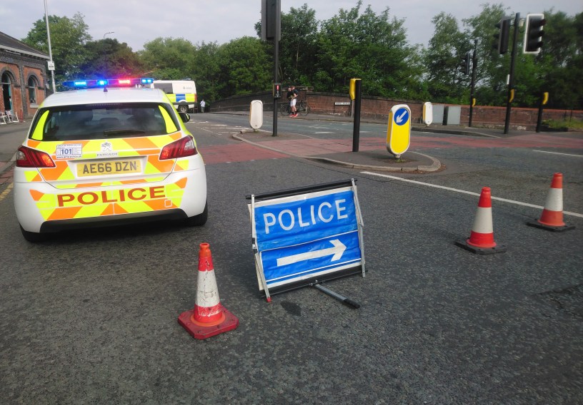 Police blocked off roads all around Brooklands Metrolink station yesterday during the morning rush hour.