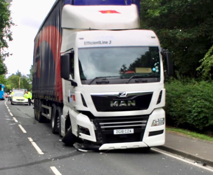 The HGV had its front left hand wheel buckled and bad damage could be seen to its side, the car though was in a bad condition, windows smashed, and the front badly damaged, and its left front wheel had been snapped off.