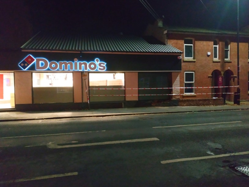 A black Citroen car had collided with the side of Dominos Pizza, the driver suffered minor injuries.