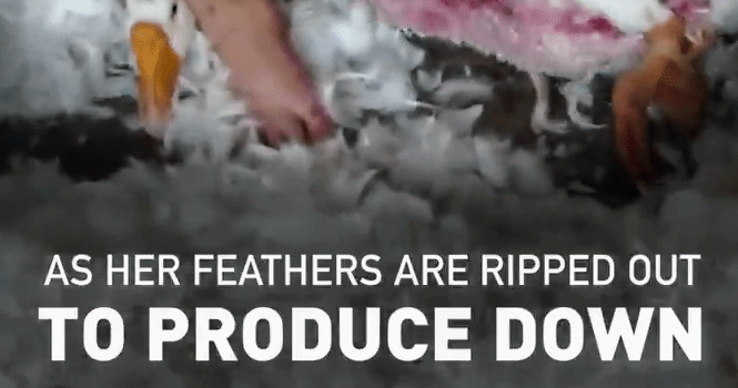 Ducks and geese are plucked to death for their feathers to keep humans warm according to PETA (Peoples Ethical Treatment of Animals)
