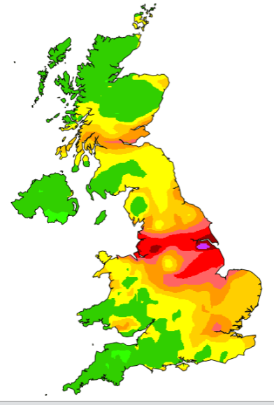 On the UK image you will see different colours, the red indicates an 8 which is high, the pink areas around Hull is tops at a 10 and people even those fit will feel the difference.