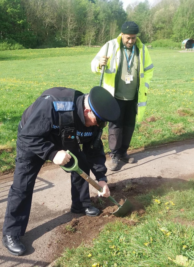 Two community bobbys helped clear a path on a park in Partington and more work is to be done soon.