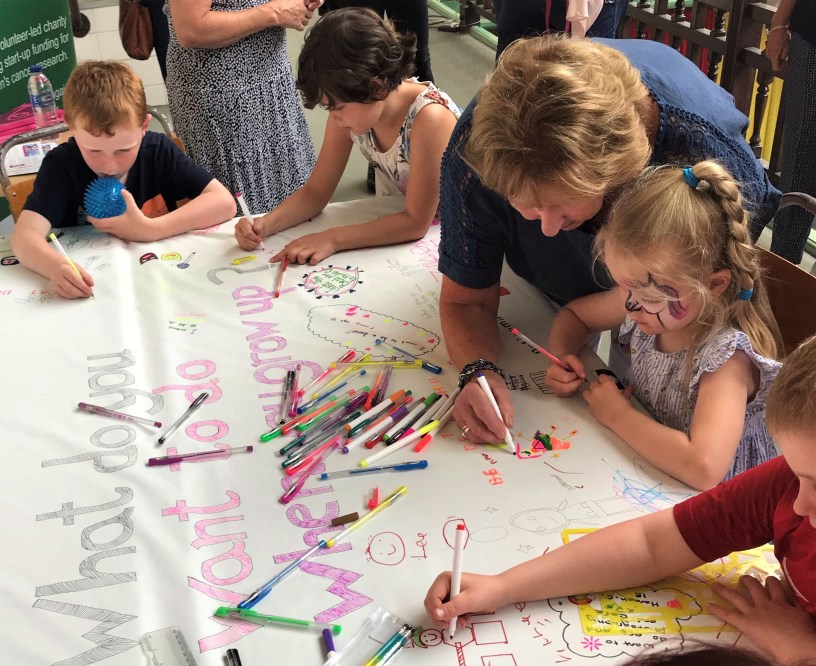 The charity attended the event and provided a huge fabric banner and coloured pens and let the children’s imaginations go wild as they thought about their ideal future. Kenzie, age 12, wrote, “All I have is poison in the blood and when I grow up, I want to be a nurse to help others like me”. Samuel, aged 8, aspires to follow in the footsteps of the Apollo 11 crew and be an astronaut and Jack, also aged 8, sees himself as a Youtube star. Perhaps one of the most poignant messages was written by the sister of a young girl who is currently being treated for osteosarcoma, a type of bone cancer, simply writing, “I wish to help the world”.