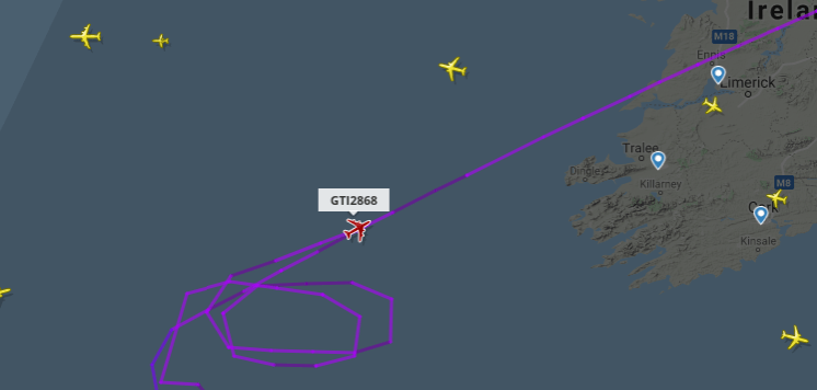Looking back on Flight Radar 24 we can see the aircraft was in a holding pattern 38,000 ft in the air a few miles from the coast of Southern Ireland.