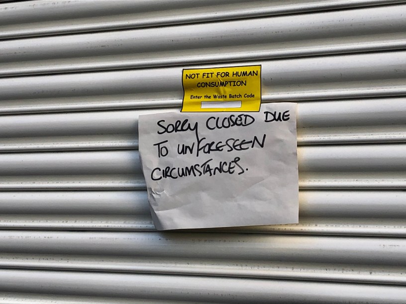 A note on the front of the store said “Sorry closed due to unforeseen circumstances”