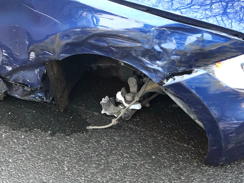 What we know about this crash is the Blue car blocking the westbound side of Park Road heading to Washway Road is a right off, the left-hand side wheel has come off and big scrapes are on the side of the car.