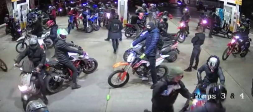 Images show a large group of men on motorbikes entering the forecourt of a petrol station on Altrincham Road before some of them then proceeded to enter the garage store and take a number of items.