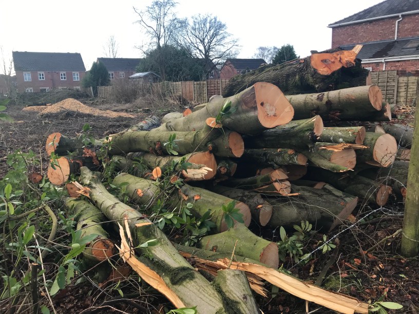 All trees have been destroyed including some very healthy looking trees, the site is huge and could easily include some much needed shops.