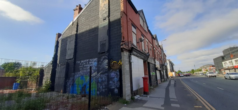 Trafford Housing Trust is finally getting rid of the block where the old Post Office used to be, Manchester Fireworks and a tattoo shop is the only businesses currently still open.