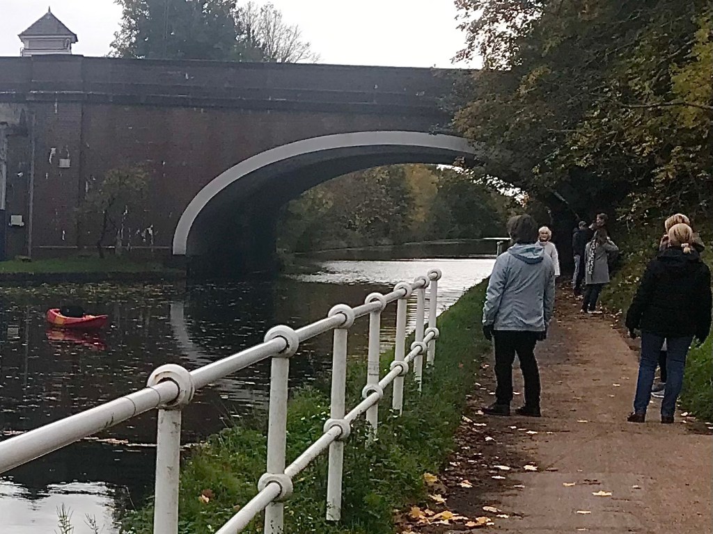 People gathered just before the bridge and a canoe was seen in the middle of the canal with the occupant on the other side of the canal tow path.