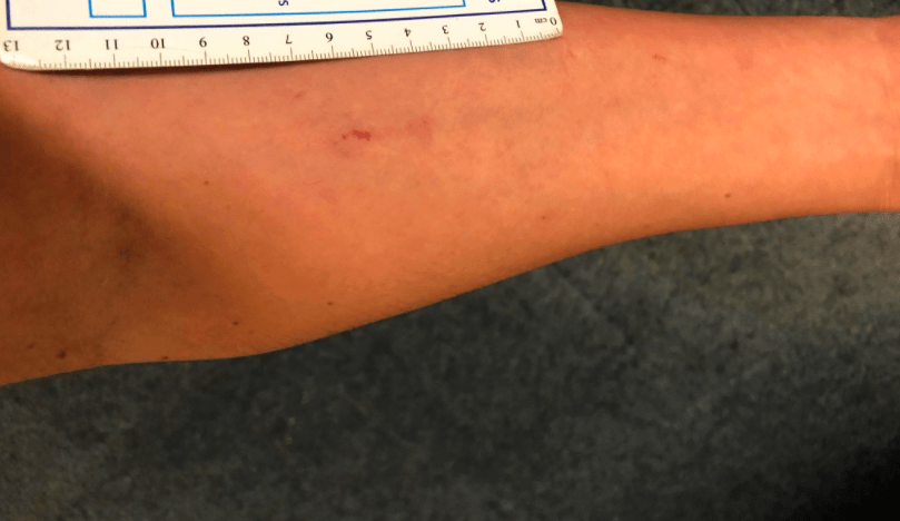 Whilst the officer was trying to resolve the issues the female ran towards the officer in a bid to escape, however she was restrained, whilst in progress she clamped down on the officers forearm causing some bruising and a superficial scratch which can easily be seen.