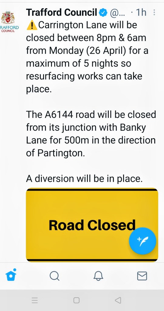 Carrington Lane will be closed from Monday 26 April 2021 from its junction with Bankey Lane heading west towards Partington.