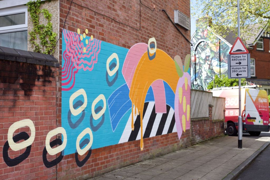 With five murals painted directly onto local residents’ houses and a convenience store, the sixth, Together We Are One by Robert Lomas and Becki Miller, resides on a wall in Seymour Park. The mural design features bold colourful letters that form the word ‘Together’. Each letter design is unique and connected to each other to celebrate the diverse communities that live in Old Trafford.