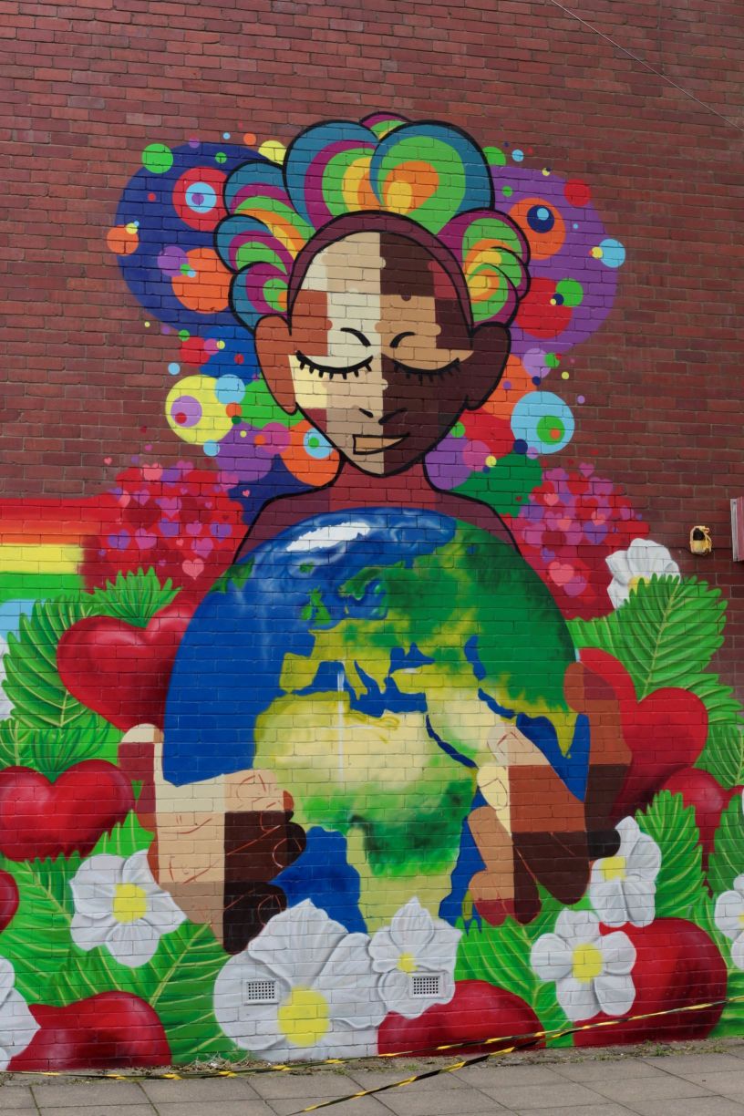 On Stamford Street, Donna Michelle Griffith and Lynda Sterling have combined traditional painting techniques with more contemporary street art styles to create the Tree of Life, whilst Martene Rouke’s Voices of The World on my Doorstep (Cross Street) presents a jigsaw-like image out of bold colours showing the community connecting with each other. It features the words “Hello, how are you?” in a number of community languages.