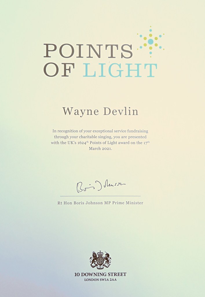 Points of Light are awarded to outstanding individual volunteers for making a change within their community. Wayne has received the 1624th Points of Light award.