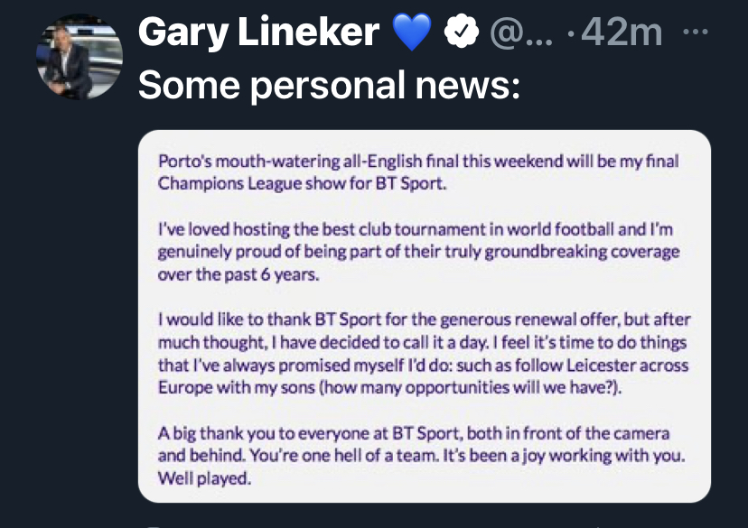 Lineker pushed out a tweet with a small statement telling everyone that despite a generous offer to stay on as the presenter of the BT sports presenter he wanted to spend more time with his family and to follow his team Leicester.