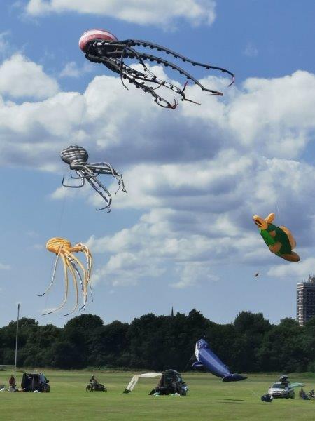 The professional flyers arrived an hour before the start time as they had to drive onto the fields to set up their arena to ensure the public didn’t get too close from a safety point of view. The kites were so big they had to be attached to back bumpers to ensure stability.