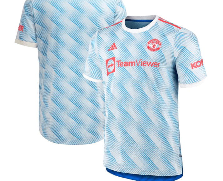 The shirt made by German sportswear giants Adidas is a off white background with a blue zig zag type pattern with the Adidas logo on the right and the United logo to the left with new shirt sponsor Team Viewer going across the top middle of the shirt and Khoker logo on the arm.