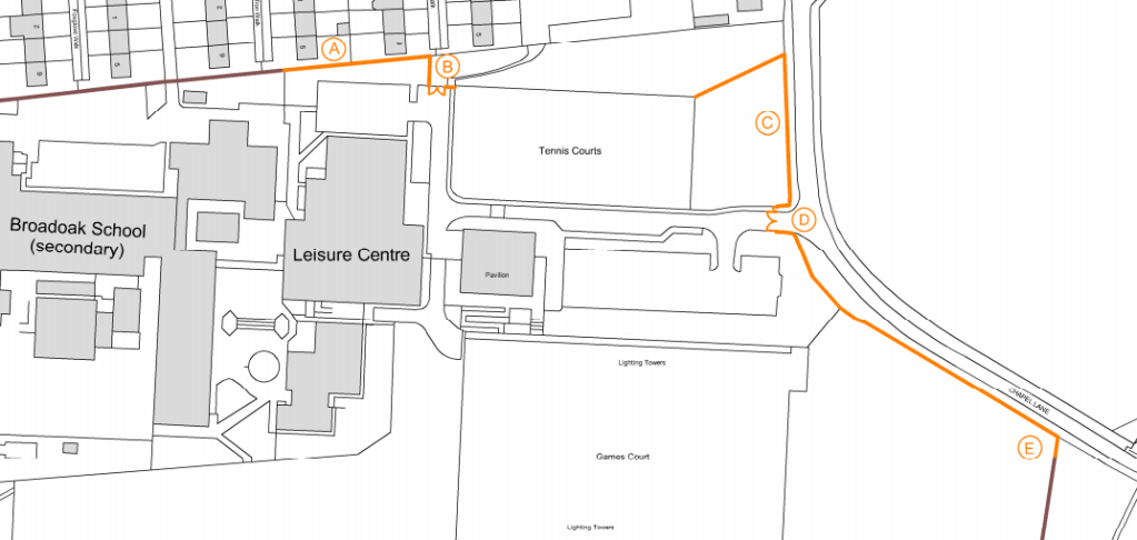 The new higher fence will go up from Chapel Lane at the entrance of the trail all around past the harmful 5G and 4G masts, a new gate will be built to the entrance of the sports centre and more new fencing will go around and up to the tennis courts, another bit of high fencing is proposed to go up at the car park near to houses to the right of the sports centre which will mean people will no longer be able to cut through to the sports centre.