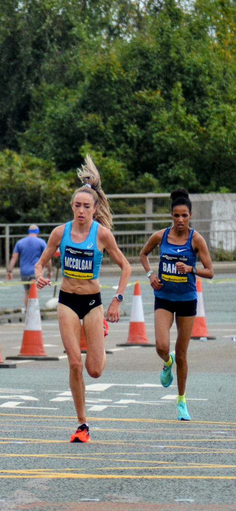 At around 11.30 am the noise of the BBC helicopter got louder which told us the elite athletes were near, and shortly after they came past making it look easy, for the most part Eilish McColgan and Meraf Bahta was battling it out and that is how it finished with McColgan winning the race with a time of 30:52 and Bahta 31.44.