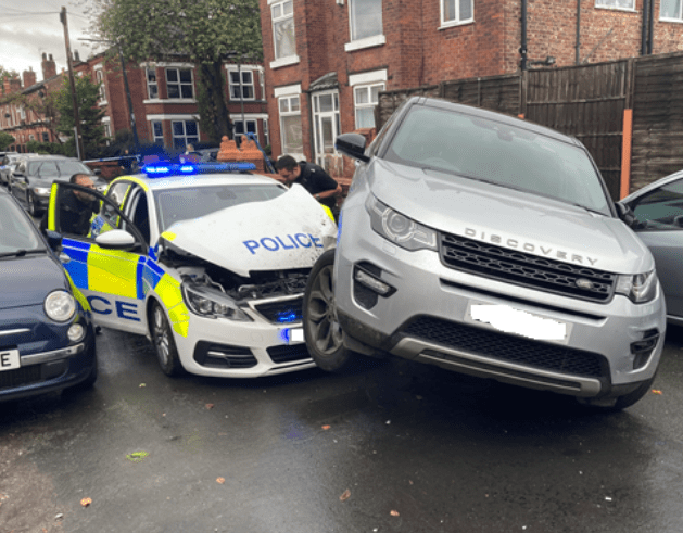 Officers then engaged in a pursuit of the landrover which proceeded to ram the police vehicle on Manor Avenue in Sale before making off again. police continued in pursuit this time to Dartford Road in Urmston where yet again the Landrover proceeded to ram a police vehicle causing significant damage to the car and a parked vehicle.