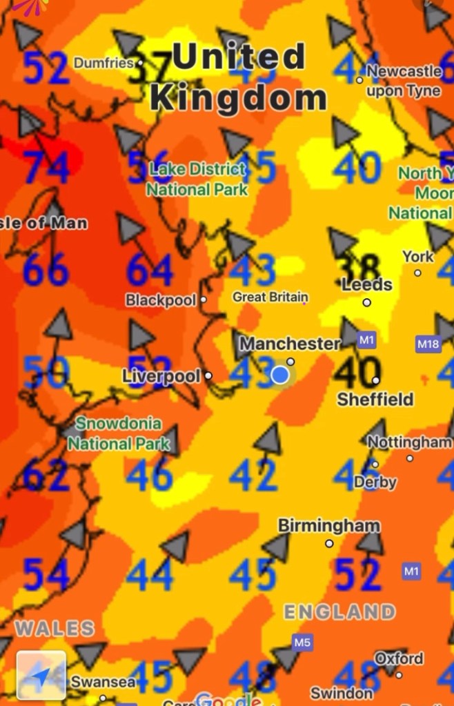 Manchester being further inland will suffer less than the west coast however will still up to 50mph gusts for much of Tuesday.
