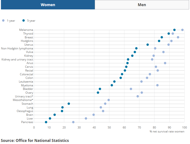 Looking at the below chart of all cancers, Ovarian Cancer has a 42% survival rate in three years.