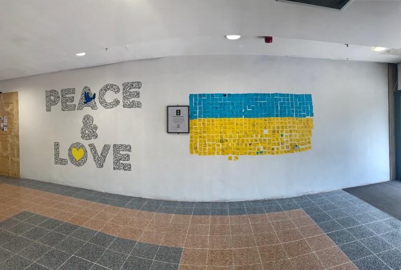 On the wall is wording Peace & Love followed by a framed picture with a small statement called “Community wall of care” and says “Show support for the people of Ukraine by writing messages of hope on the yellow and blue post it notes and help us make a Ukrainian flag of love.