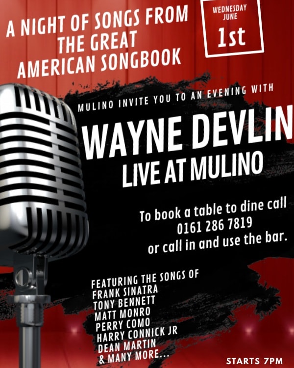 You are welcome to call in and use the bar to listen or you can telephone Mulino on 0161 286 7819 to book a table for a lovely Italian meal whilst Wayne performs.