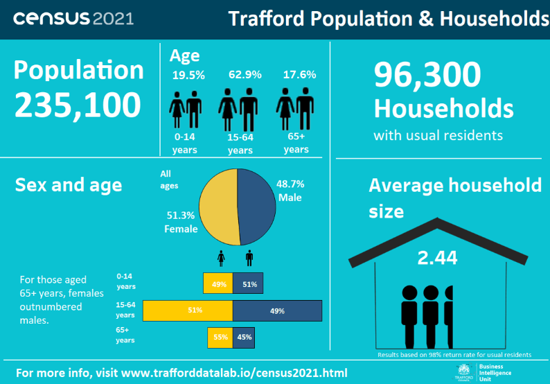 For more information on the Census results, please log on to Trafford Data Lab will contain all the data related to Trafford: https://www.trafforddatalab.io/census2021.html The initial findings from the 2021 census in England and Wales are available from the ONS, including a rounded population and household estimates statistical bulletin and an animated visualisation report on how Trafford’s population has changed since 2011.