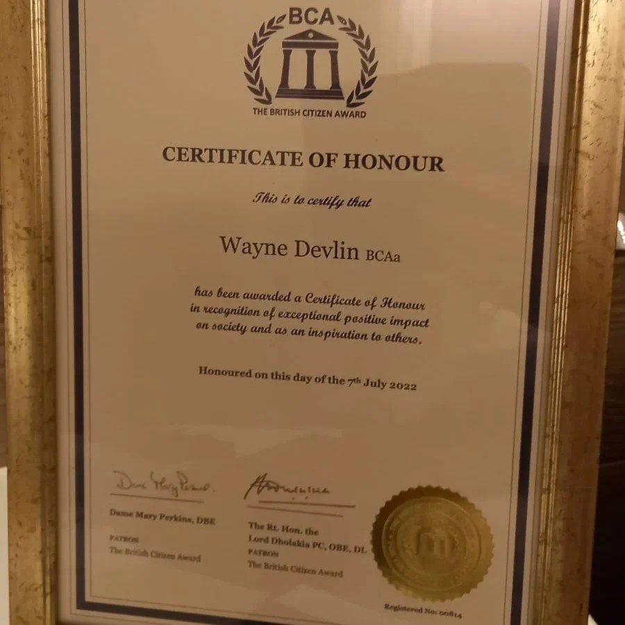 Wayne Devlin, from Urmston, Manchester is one of only 25 individuals to have been recognised at the Palace of Westminster with the prestigious British Citizen Award (BCA) in recognition of their extraordinary endeavours.