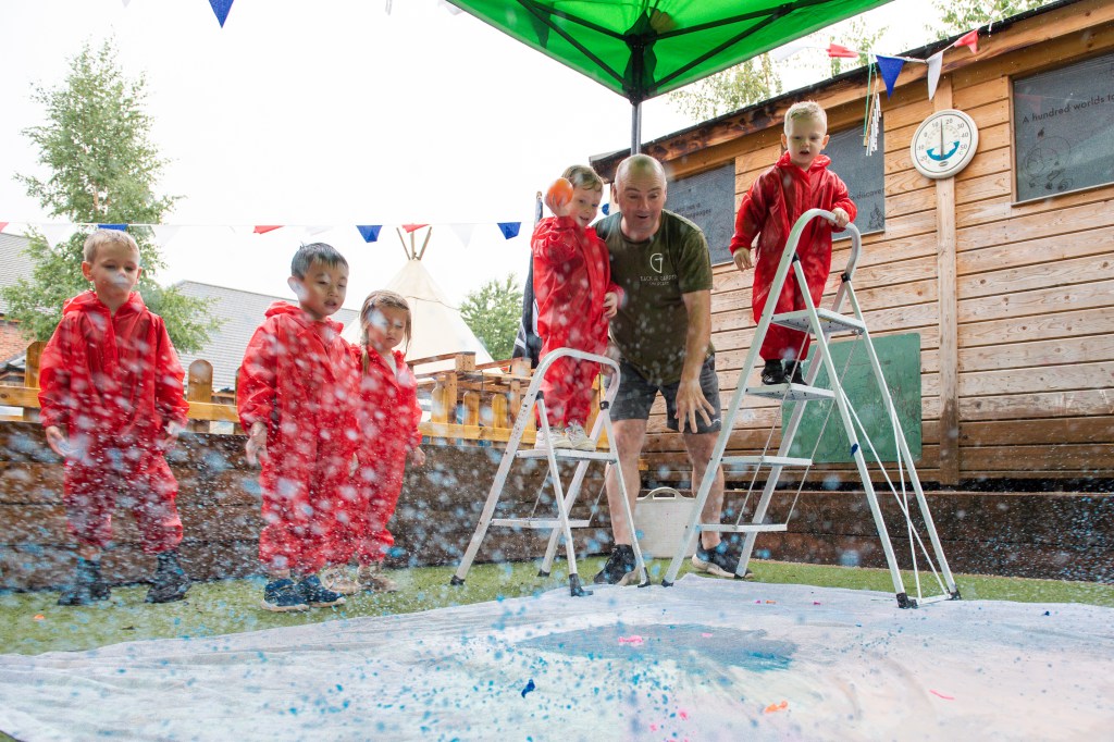 The pre-schoolers at Back to the Garden Childcare, the natural child-led day nursery on Sinderland Road in Broadheath, came together in the setting’s beautiful garden for a morning of unstructured free-flowing creative expression that included throwing water balloons filled with paint at a large sheet to create a giant piece of textile artwork that is now hanging proudly in the nursery’s reception area for all to see.