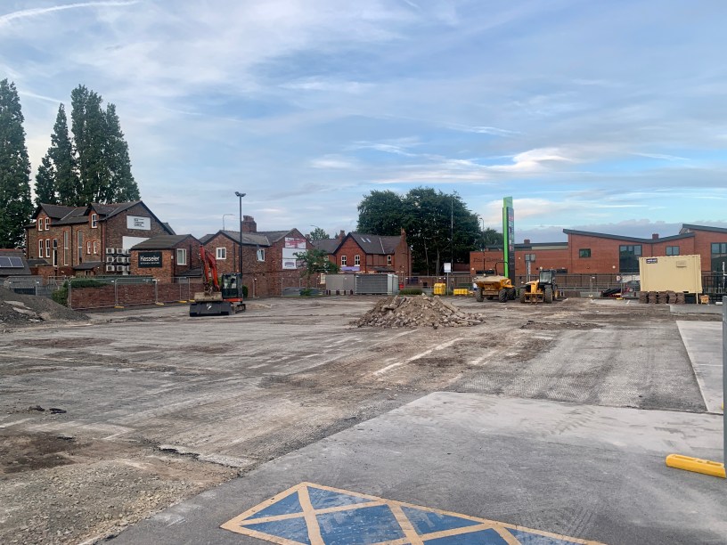 The car park area from Homebase to near the bus stop on the A56 is now being dug up getting ready for the new flower Centre, we expect the demolition of the existing flower and pot store at Homebase will begin soon.