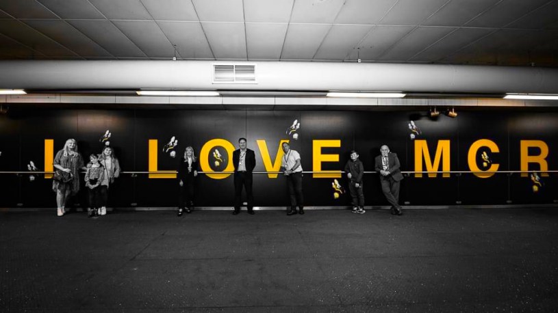 Bearing the words ‘I LOVE MCR VICTORIA,’ the the striking yellow letters on a dark background are surrounded by Manchester bees.