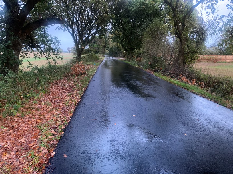 The surface is excellent, Probably the best treated road we have ever seen with low rolling resistance and good grip in wet conditions however we checked the sides and found it needed flattening out so all road users are safe.