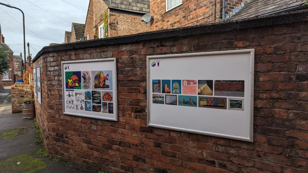 The works on display in the Back Gallery have been printed onto vinyl and mounted on the brick walls of the back alleys. The original artworks – some of which are on display in the window of OT Creative Space on Ayres Road – feature a wide range of styles and mediums, including watercolours, prints, acrylic on canvas, digital art, photography, embroidery and even cardboard sculptures.