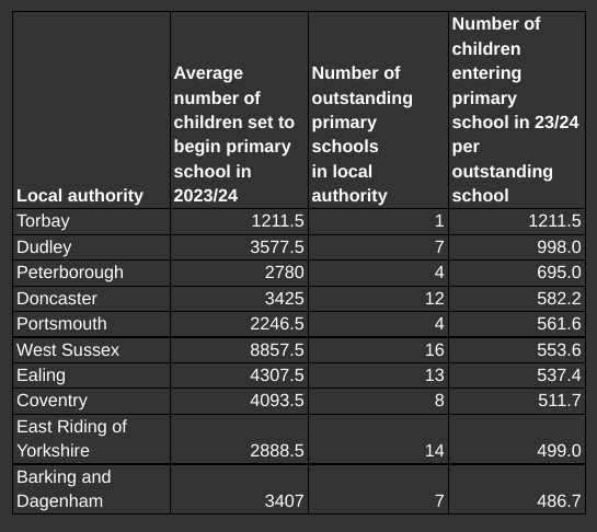 The figure was calculated by taking the number of children set to attend primary school in the 2023/24 academic year, and comparing it to the number of outstanding primary schools per local authority,