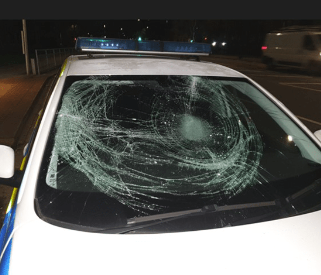 On return to the police car they found some mindless thug had badly smashed the front windscreen which meant the officers could not continue protecting the community and had a wait for the car to be recovered.