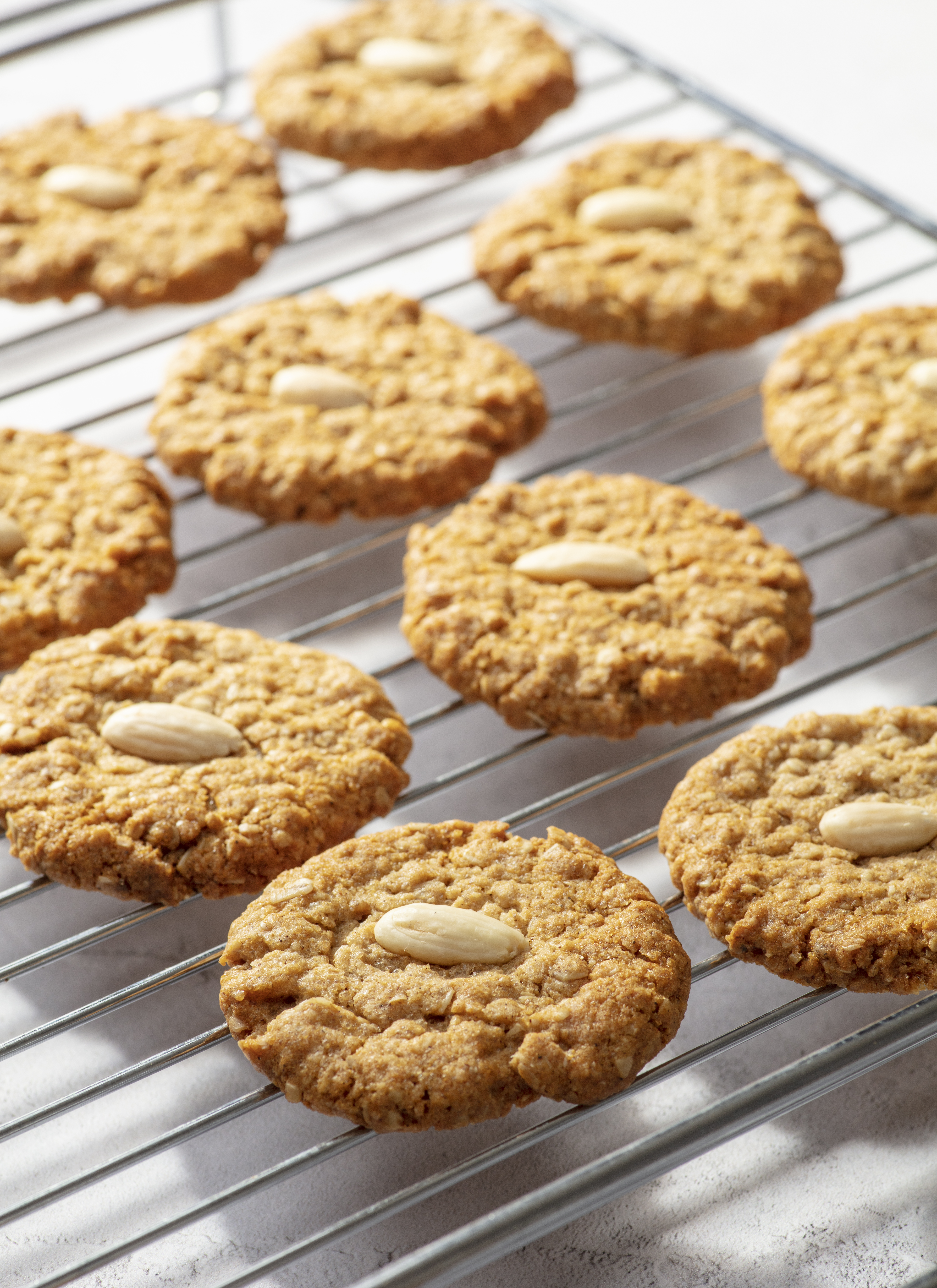 - Gently press the tops of your biscuits with your thumb and top each with a blanched almond.