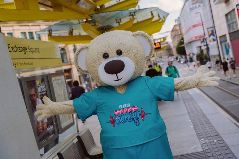 A life-size, scrub-wearing teddy bear took to the trams to mark the Science and Industry Museum’s summer transformation into a teddy hospital, inspired by its new world-premiere exhibition, Operation Ouch! Food, Poo and You.