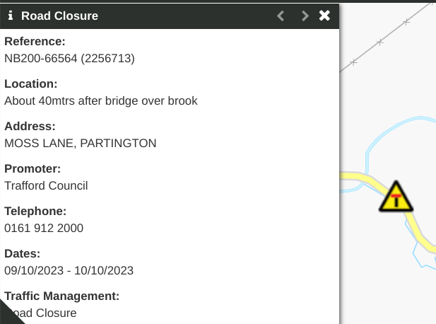 According to GM Roadworks Moss Lane/Covershaw Lane just out of Partington is to be closed tomorrow for one day.