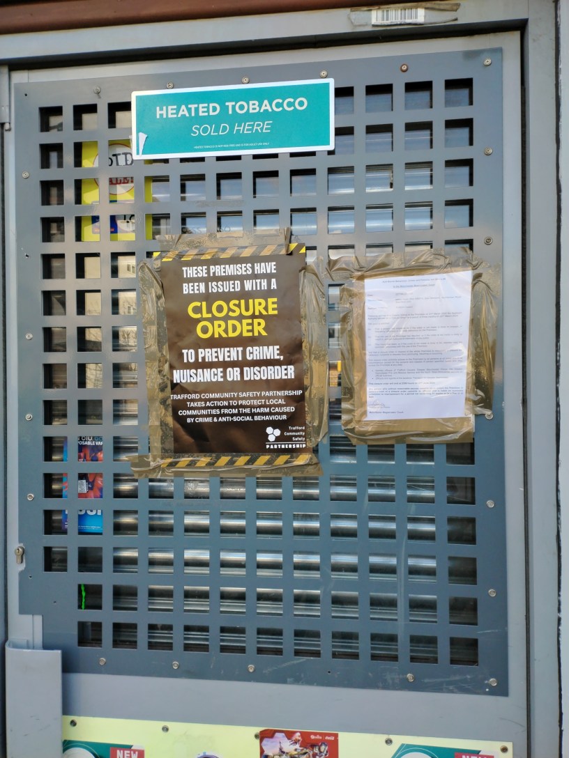 Police and Trafford Council’s Trading Standards have obtained a closure order from the magistrates court after the newsagents at Sale Metrolink station were found to have been selling illegal vapes.